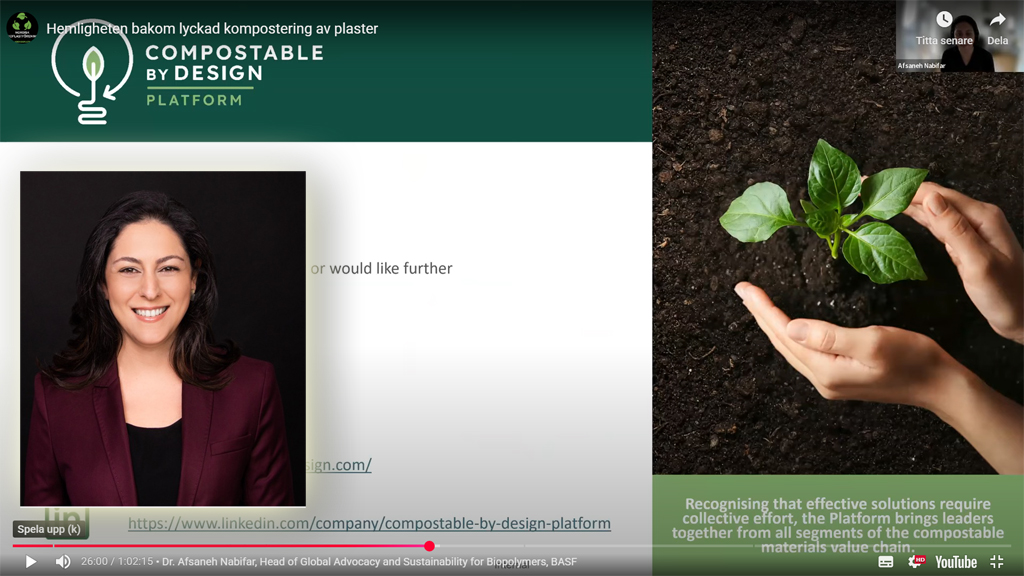 NBF:s service att erbjuda möjligheter till medlemmar och andra intressenter att i efterhand se och lyssna på föreningens webinarer är alltså ett utmärkt tillfälle att uppdatera sig om vad som händer på bioplastområdet och en unik möjlighet att informeras av experter inom skilda områden med anknytning till bioplast, etc.