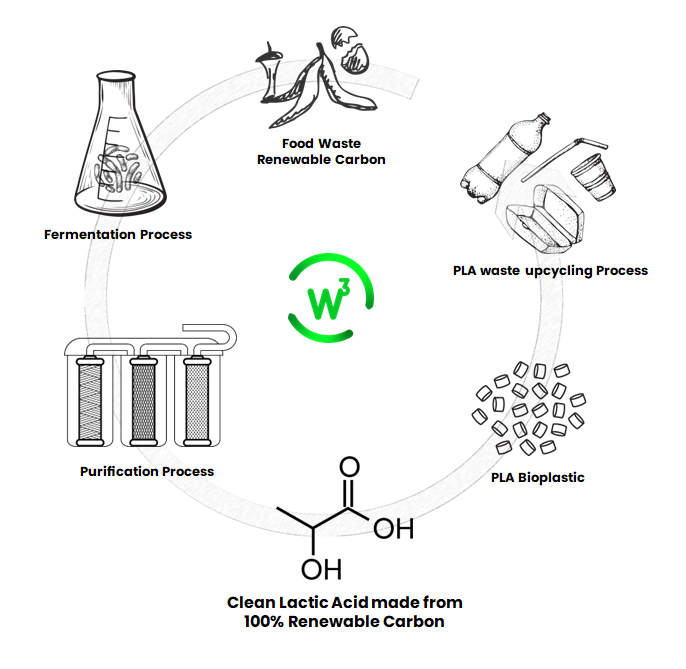 TripleW, som är en pionjär inom cirkulär kemi, uppger att innovationen med matavfallsbaserad PLA är resultatet av ett samarbete med kemteknikföretaget Sulzer Chemtech, som ingår i schweiziska storkoncernen Sulzer. Utvecklingen av PLA-bioplasten har skett inom ramen för CIRCLE, som är ett CBE JU-finansierat projekt (CBE JU = Circular Bio-based Europe Joint Undertaking).